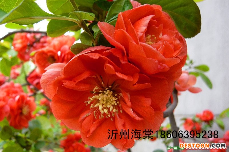 木瓜海棠(学名:Chaenomeles cathayensis (Hemsl.) Schneid.)蔷薇科木瓜属,落叶小乔木,品种有:世界一、大富贵、变色海棠、复色海棠、东洋锦、银长寿、长寿乐、福长寿、长寿冠、;花色有:大红色、水红色、绿色、白色、国旗红、一株多色、变色等:花型有:牡丹花型、重瓣、单瓣、大花、小花。栽植方法有矮化盆栽和高干地栽两种,2010年被临沂市人民政府评选为市花。单位地址:山东省临沂市河东区木瓜园艺场(汤河大南庄)邮编:276026
