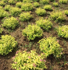 【导读】求购金山绣线菊苗木,找江苏寒冬园林,常年批发供应金山绣线菊价格优惠,规格有一年生两年生三年生高度20公分30公分40公分50公分60公分等,生长旺盛分枝多姿态优美。沭阳大型金山绣线菊种植基地大量销售中,哪里有金山绣线菊多少钱一棵,请联系我们。本文内容有:金山绣线菊图片,沭阳金山绣线菊价格表,栽植时间等相关介绍,好伙伴,大未来,欢迎访问寒冬园林。我们的苗圃还有美丽绣线菊、金焰绣线菊、粉花绣线菊等品种出售。 【特征介绍】 金山绣线菊为落叶小灌木,原产北美,冬芽小,有鳞片;单叶互生,边缘具尖锐重锯齿。羽状脉;具短叶柄,无托叶。花两性,伞房花序;萼筒钟状,萼片5;花瓣5,圆形较萼片长;雄蕊长于花瓣,着生在花盘与萼片之间;心皮5,离生。瞢荚果5,沿腹缝线开裂,内具数粒细小种子,种子长圆形,种皮膜质。由于其春季萌动后,新叶金黄、明亮,株型丰满呈半圆形,好似一座小小的金山,故名金山绣线菊。喜光照及温暖湿润的气候,在肥沃的土壤中生长旺盛,耐寒性较强,适宜中国长江以北多数地区栽培;可作观赏。 【种植养护】 金山绣线菊适应性强,栽植范围广,对土壤要求不严,但以深厚,疏松、肥沃的壤土为佳。喜光,不耐阴.在遮荫条件下,叶子变薄,变绿而失去应有的观赏价值。较耐旱,不耐水湿,抗高温,在夏季35℃以下的酷暑环境下,虽然生长缓慢,但仍不失其观赏价值。金山绣线菊非常耐寒,冬季不需任何保护措施即可安全越冬。 【园林用途】 金山绣线菊植株矮小,小巧玲珑,株型丰满呈半圆形,好似一座小小金山,春季萌动后,新叶金黄、明亮,随着植株的生长,可形成优良的彩色地被,覆盖地表,非常壮观。金山绣线菊株型整齐,可成片栽植,也可组成模纹图案,与其它大叶黄杨、小叶黄杨及草坪配置,效果更佳。若丛植于路边林缘、公园道旁、庭院及湖畔或假山石旁,将起到强化植物群落,丰富群体色彩的作用。