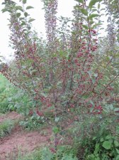 凯尔斯海棠 小乔木,树形为开放的圆形,干深褐红色。4月上旬始花,中旬盛花,花蕾深粉色。果实暗紫红色, 8月底至9月初成熟。凯尔斯海棠枝条舒展,又是独特的重瓣品种,花量大,花密集,开花时群植远观效果极佳。