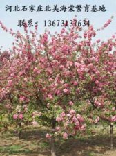 红丽海棠 乔木,树冠为平张的圆球状,枝条纤长飘逸,新叶片亮褐色,逐渐转为微红的亮绿色,4月中旬盛花,花蕾深红色,花浅粉色,果实球形,夏季亮红色,夏末至初秋逐渐转为偏亮橘红色,果实丰硕,持续冬季不落。