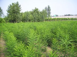 主要播种繁殖,也可扦插。春播,因种皮有细胞紧密结合的栅栏层,透水性差,播种前,用始温85-90度的水浸种24小时,余硬粒再处理1-2次。种子吸水膨胀可播种。条播行距20-25厘米,覆土厚度1.5-2厘米,每亩播种量8-10公斤,7-10天幼苗出土,幼苗期合理密植,防止树干弯曲,一般每米长留苗6-8株,一年生苗高达1米以上。也可早春集中营养钵育苗后移植定苗。国槐萌芽力较强,若培养大苗形成良好的干形,可在第二年早春截干,加大株行距,当年苗高3-4米,树干通直,粗壮光滑。 鄢陵县宣禾园林绿化有限公司 河南省宣禾绿化有限公司 河南省鄢陵县是中国北方**大的花木种植销售集散地,有花乡、花都之美称。鄢陵县宣禾园林绿化有限公司采用基地加农户的多种种植经营方式,种植和培育了多种花木,具有数量大,质量好、价格优,移植成活率高等多种优势。本公司主要经营品种:杨树,楸树,栾树,红叶碧桃,白腊,青桐,国槐,垂柳,大叶女贞,香花槐,紫薇,红叶李,樱花,矮樱,木槿,河南桧,蜀桧,海棠,榆叶梅、法桐,红白黄紫(玉兰),广玉兰,雪松,金枝槐,龙爪槐,丝棉木,腊梅,金叶榆,枫杨,紫荆,红梅等品种。本公司本着诚实、守信、顾客就是上帝的经营理念,热忱欢迎四海宾朋前来参观考察、洽谈。联系人:李国行固话:0394-6813881电话:15038980005地址:河南省鄢陵县大马镇南丁庄村 1.适时截干 每年在春季生长停止后,第二个生长季节来临前(一般在7月上旬),将顶端弯曲部分剪断,发出新枝后,选择一个垂直向上的枝作新的主干。 2.合理整枝 所谓合理整枝,就是在不影响主干生长的情况下,尽量多保留一些侧枝,这样有益于树干的加粗生长,加快木质化进程,避免树干弯曲。 具体操作下: (1)水平枝和接近水平的枝一般不剪,让其自然整枝。 (2)影响主头生长的竞争枝要及时剪掉。 (3)对不形成竞争生长的其它侧枝控制其生长,当其粗度达到主干粗度的1/2时应及时剪除。防止主干尖削度过大,同时提高主干高。若剪除过晚伤口大不利于愈合。 3.再次截干 对2~3a生的苗木,当春季开始生长时,如果苗木没有明显的主头或是有主头但过于偏斜的应再次进行截干,剪口选在开始偏斜部位即可。 4.保持合理密度 小苗地径2cm,每公顷留苗45000~60000株,大苗胸径4.5cm以上,每公顷留苗12000株左右。这样既保证光合需要,又能达到自然整枝的要求。 5.其它措施 幼苗期多施磷钾肥,生长季节加强叶面喷肥,有助于加强光合作用,加快木质化进程,防止主干弯曲。总之要想培育合格的国槐苗木,关键要掌握3点: ①及时截干、换头。 ②避免过度修枝。 ③保持合理密度。 国槐的嫁接繁育 1 枝接 用两年生的普通国槐做砧木,露地在清明前截取长有4至5芽的槐枝段进行腹接法繁育,也可在温室育砧木苗,在当年六月份进行芽接繁育,这样当年就可育出成品苗。具体方法:将国槐种子先进行低温休眠处理,即把种子和沙子(湿度80%)拌和好,放到背荫处,进行沙化休眠,温度在0℃左右,以不冻成冰坨为宜。五十天左右就可上温床催芽,等到百分之四十出现小白芽,就可在温室做畦插种。六月中旬,当小苗基部长到0.5厘米时就可嫁接。此时主要是芽接,带木质双舌对接。方法是:用接刀在砧木基部向下斜切一刀,然后从其上2.5厘米处向切口削下,深度达木质部2毫米,成为一个舌状槽。再从接穗上用同样的操作方法切取同样大小的舌状芽片放入舌状槽(砧木和接穗粗细必须相符,不能差距太大,以免造成形成层不能吻合,降低成活率),用塑料膜绑紧,随后从接芽向上留3至4片叶子,剪掉多余部分,促进营养回归,使接芽尽快愈合成活。国槐的树种特性。国槐发枝率低,树干中下部无侧枝,树干增粗缓慢,且这些树大都木质坚硬但木质化进程缓慢,使得幼苗树干细软,因苗木上部含水量高,叶片密集,在第二次生长时易萌发分枝,造成头重脚轻,经风雨日晒,苗木自然弯曲。另外由于害虫咬食幼尖造成大量萌生枝而形成无头苗木。 2 芽接 嫁接时,先处理砧木,后削接芽,接芽随采随接,以免接芽失水影响成活。采用“丁”字形芽接,先在砧木离地面3.5厘米处切“t”形口,深度以见木质部,能剥开树皮为度;再用刀尖小心剥开砧木树皮,将盾形带叶柄的接芽快速嵌入,用宽2---3厘米的地膜条绑紧{牙上**多覆2层膜,牙上下可多缠几层}。芽接后培土10厘米高。10-15天后刨开土,检查成活情况。如芽片新鲜呈浅绿色,说明已经成活,否则没有成活,应在砧木背面重接。 高枝嫁接一般在春季进行。砧木的处理:尽量选取与接穗粗细相近的枝条,在预接部位以上8-----10厘米处剪除(接活后用以固定新芽)其它枝条剪除。 搞好接后管理 秋季芽接的苗木,翌年入春后在芽接点以上18-20厘米处截干。夏季进行3-4次修剪,剪去砧木发出的枝条。接芽枝条长到8-10厘米长时,在靠近基部处将其缚在活桩上;长到20-25厘米长时,再在上端缚一次。直至接枝木质化,切去活桩,可继续留在大田培育大苗。 春天高枝嫁接的,要及时除蒙。当接芽长到4----6厘米时,要及时固定在预留的砧木上,防止被风吹折。国槐_河南国槐价格