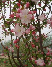 2、北美海棠:凯尔斯海棠小乔木,树形为开放的圆形,干深褐红色。叶片椭圆形,先端渐尖,锯齿浅。4月上旬始花,花蕾深粉色,表面邹折,开放后花深红色,并逐渐变浅,花重瓣,花瓣13枚左右,上有白色斑纹,量大密集,直径5cm;果实暗紫红色,表面有一层蓝紫色蜡霜,球形,直径1.8cm, 8月底至9月初成熟,转为黄色后脱落。凯尔斯海棠枝条斜展,又是独特的重瓣品种,花量大,花密集,但果实早落。
