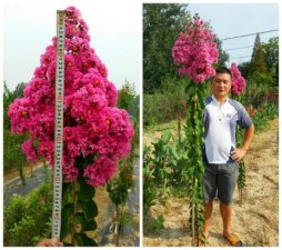 紫薇品种目前在速生与花红问题上,始终不能协调,所不尽人意的是花红的不速生,速生的花不红,这一现象一直困扰着绿化园林界。人们希望,如果有花色是大红又非常速生的紫薇品种该多好。本公司经过多年的努力与品种积累,从引种栽培的数十个紫薇品种中终于选出了一个既是花色大红又非常速生的紫薇新品种——“速生鲜红花紫薇”。