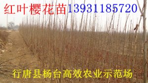 红叶樱花**新价格红叶樱花是近几年新培育的绿化苗木,在城市及农村绿化苗木当中异军突起用量极大,红叶樱花又是樱花苗木中的佼佼者,它不仅花色鲜艳,而且叶色红色煞是美观,它的生长速度极快,广泛用于园林建设。我场今年用野山樱苗嫁接了大量的红叶樱花苗,高度在1-2米,价格3-4元一棵或随行就市,需要量大价格优惠,并可送货。我场另有其它普通樱花、西府海棠、绚丽海棠、王族海棠、红宝石海棠、垂丝海棠、中华太阳李、红叶李、紫叶矮樱、红叶碧桃、核桃苗、花椒苗、杏树苗、桃树苗、速生杨、苹果苗、毛桃苗、山杏苗等苗木低价出售。13931185720河北省石家庄市行唐县杨台高效农业示范场