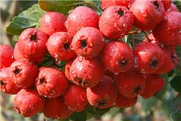 二、美食山楂——“蒙山红” 从平邑县山区实生山楂树中选出的优良品系,属品质极佳的优良鲜食品种。该品种果皮桔红色,有光泽,果肉淡黄,肉质细嫩,脆甜微酸,十分爽口,适于鲜食,品质上乘。单果均重 16 克**大 23 克, 10 月中旬成熟,较耐贮存,贮至翌年 4 月,甜味更浓,风味更佳,是馈赠亲友的特殊礼品。该品种丰产性状极好,三年结果,五年丰产,盛果期亩产 3500 余公斤,自然坐果率高达 40% 以上,平均每穗坐果 10 余个,**多每穗可达 36 个,累累红果十分惹人喜爱。同时该品系适应性极强,抗旱耐瘠,适于山区发展,对炭疽病、轮纹病和白粉病等也表现了极高的抗性。