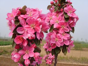 海棠小苗: 18世纪以来,欧美等国家的园艺工作者在从中国大量引种和杂交选育的基础上,培育出一系列海棠品种,一般称为北美海棠(美洲观赏海棠)。虽然这些品种高度园艺化,但主要亲本多为原产我国的山荆子、红肉苹果、楸子、三叶海棠及美洲的褐海棠、草原海棠、花冠海棠等。北美海棠花期为4月上旬,花色红艳夺目,花型美丽动人,团团锦簇,在5~6月间徐徐长出色彩艳丽的新叶,继而在满树红绿交映的叶丛中缀出姹紫嫣红,累累玲珑的海棠果,等到7~8月里已经是红透透的挂满整树,并且一直挂果到翌年春天,是不可多得的集观花、观叶、观果为一体的观赏树种。北美观赏海棠适应性强,全国各地均可引种栽培。