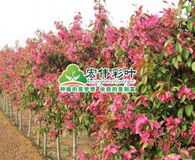 信息描述:绚丽海棠树形紧密,小枝暗紫色。树皮纵裂,多刺状短枝。嫩叶紫红色,逐渐变为翠绿,花期4月下旬,花深粉红色,花径3.5厘米,开花繁而艳。六月果实成熟,灯笼形果实,且萼片宿存,果实亮红色,鲜艳夺目,直径1.2厘米,6月就红艳如火,直到隆冬。绚丽海棠的花和叶都非常美丽,在园林绿化中广泛应用,主要用于公园小区庭院的绿化。