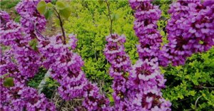 紫荆,丛生或单生灌木,高2-5米;树皮和小枝灰白色。叶纸质,近圆形或三角状圆形,长5-10 厘米,宽与长相若或略短于长,先端急尖,基部浅至深心形,两面通常无毛,嫩叶绿色,仅叶柄略带紫色,叶缘膜质透明,新鲜时明显可见。