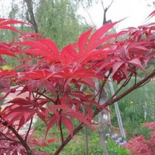 日本红枫,它既是理想的园林景观树,又是制作盆景的好材料。小乔木,生长速度中等偏慢,地栽高5~8米,树姿优美,分枝平展,层层如云,姿态婆娑,叶形秀丽,春秋叶片鲜红色,盛夏紫红;5月开花,花色淡红,花后结翅果,形如元宝,种子10月成熟。日本红枫树性强健,对环境要求不严,耐半荫,喜肥沃、湿润耐排水良好的土壤,耐-25℃低温,东北地区盆栽可在室内或大棚中越冬。