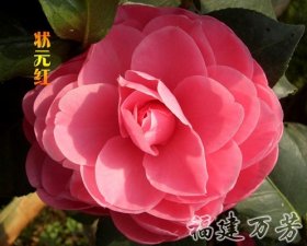 状元红茶花:又称“葡萄红”,是国内传统名品,中、小花型,花径约6厘米左右,花型为完全重瓣型,中心部分70%的花瓣向内扣,外延部分30%的花瓣向外翻,花型很有特色。花色为玫瑰红色,直立性生长,自然树型很好,叶色浓绿,富有光泽,叶片密度高,着花密集,长势中等,为优良的盆植茶花品种。