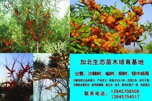 我公司名称“加北生态苗木培育基地”,地点在大兴安岭加格达奇加北乡。主要培育的深秋红沙棘品种产地芬兰,其**大的特点是耐寒,耐瘠薄,果实色泽鲜艳,营养价值极高。挂果期长,经冬不瘪不落不褪色,景观醒目独特。树高可达5米以上,冠幅舒展,可以春秋两季栽植,成活率几近100%。现经5年引进培育,...批扦插苗木4年生已3米左右高,株树约为12000左右,另有40-80公分沙棘小苗约4万株。此外还有2年生榆树苗约8万株,高50公分左右。