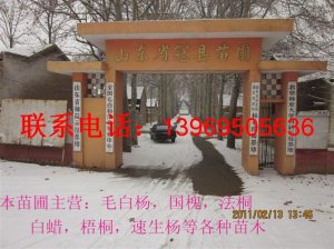 山东冠县国有苗圃,现有苗木基地两万余亩,是集园林绿化工程、城市绿化工程设计,施工,养护 ,苗木生产,营销为一体国有苗圃。有正式的营业执照和苗木经营许可证,可开具发票,三证齐全代办检疫,有专车接送。常年大量供应毛白杨嫁接一条鞭,炮捻,速生杨107,泰青杨,速生柳种条种苗,1-30公分毛白杨,107速生杨,国槐,刺槐,龙爪槐,白蜡,法桐,泡桐,臭椿,千头椿,速生柳,垂柳,黄柳,合欢,栾树,银杏,紫叶李,红叶李,大叶女贞等30多个品种。裸根带土球均可,具有品种多、规格全、纯度高、质量好、价格低的特点,深受广大客户的喜爱,苗木生产一年四季供应北京、山东、天津、河北、山西、黑龙江、辽宁、吉林、江苏、浙江,陕西,河南,四川等地区。 所供应苗木均有现货,数量大、纯度高、质量好、价格低。