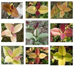中华锦桂从抽芽到叶子成熟历经8个以上的颜色变化,一年反复变色4-5次,紫咖啡、紫红、桃红、米白、金黄色、芥末黄、赭黄、草绿色、深绿色......