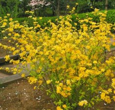 棣棠花(学名:Kerria japonica (L.) DC.):灌木,高1-2米;小枝有棱,绿色,无毛。叶卵形或三角形,先端渐尖,基部截形或近圆形,边缘有重锯齿,上面无毛或有稀疏短柔毛,下面微生短柔毛;叶柄无毛;有托叶。花单生于侧枝顶端;无毛;花直么3-5厘米;萼筒扁平,裂片5,卵形,全缘,无毛;花瓣黄色,宽椭圆形;雄蕊多数,离生,长约花瓣之半;心皮5-8,有柔毛,花柱约与雄蕊等到长。瘦查黑色,无毛,萼裂片宿存。