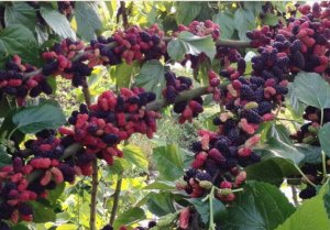无果桑新品种—椹莓098是山东省果树科技人员经过六年的时间,选育出的优系单株,编号是098。 该品种树形开张,枝条细长,花果极多,果实较大,圆筒形,平均单果重3.8克,**大果重10.5克。果实成熟后由紫红色到紫黑色,果面光泽性强,颜色鲜艳,光亮美观,象黑珍珠一样。口感酸甜适口,出汁率74-78%,可溶性固形物9一16%,货架期5天左右。第二、三次结果为付芽结果,分别在8、10月份,果个较大,一般在3克以上。该品种生长快、产量高,二年生树平均株产3公斤左右,三年生树平均亩产2000公斤以上。用该品种建大棚,可实现4月份栽植,10-11月份扣棚,元旦、春节、五一上市,亩产可达1000-1500公斤,每公斤60-200元,亩收入六万元以上。叶片可养蚕或炒茶,果实可加工成罐头、果汁、酒、茶、还可以加入酸奶中,应用广泛,速冻果和加工品市场出口前景广阔。该树种适应性广,抗性强、生长快,结果早,效益好,果实美观,采摘期长,是当前建设生态采摘园的首选品种。也是山区丘陵地区**有发展前景的致富项目之一。
