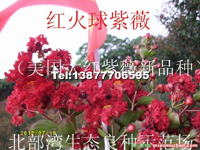 红火球紫薇(美国大红紫薇新品种) 千屈菜科紫薇属落叶乔木,美国大红紫薇新品种,是难得的大红色紫薇佳品:花鲜红如国旗,俨如一团火球,甚是耀眼。花在晴热天为猩红色,多云凉爽天气则为亮红色,有时还带有白色的边,美丽多彩。新叶深红色,老叶绿色。6月初始花,花期可达5个月,花后及时修剪,可多次开花。耐旱,可耐-23℃的低温,抗病性较强。是制作盆景、桩景的良好材料,可孤植或丛植。是极其少见的大红紫薇品种,品种资源极其稀少,观赏价值极高,市场前景广阔,是常规红花紫薇是无法比拟的。