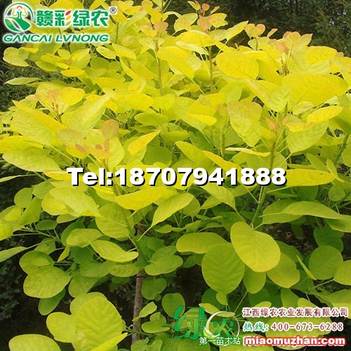人们已经熟悉了普通黄栌秋季那深栗色的叶子,而今黄栌家族又有了新成员,一种金黄叶色的新品种在欧洲诞生了。金叶黄栌,漆树科黄栌属,落叶灌木至小乔木。株高5米左右,树形近圆形,小枝赤褐色,叶片互生,金黄色,卵形至倒卵形,叶背无毛,全缘,长约7厘米,圆锥花序顶生,紫红色。它具有浓密的金黄色叶子,开花时,白花开满枝头,整个植株看起来像笼罩在白色烟雾里。到了秋天,它展示出丰富的色彩,橘色、红色还有珊瑚色,非常迷人。金叶黄栌生长快,枝条直立,节间短,叶密集,在强光直射下叶子也不会变焦,充足的光照下叶子会变得很透明,而且金黄色更加耀眼。秋天呈现橘色、红色等;夏天,白色的花如同一团青烟,在欧洲,人们也称之为“如烟树”。片植或丛植于山坡、河岸等地,与常绿植物配植,效果出众,春季为金黄色叶片,夏季稍泛绿,秋季又呈彩色叶片,十分壮观。 供苗:试种100株45元每株,最少20株起邮50元每株。