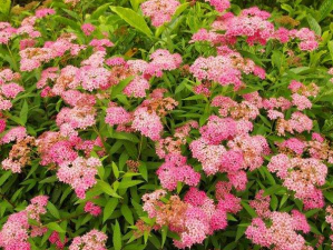 粉花绣线菊别名蚂蟥梢、火烧尖、日本绣线菊,蔷薇科、绣线菊属直立灌木,高可达1.5米;枝条开展细长,圆柱形,冬芽卵形,叶片卵形至卵状椭圆形,上面暗绿色,下面色浅或有白霜,通常沿叶脉有短柔毛;复伞房花序,花朵密集,密被短柔毛;苞片披针形至线状披针形,萼筒钟状,萼片三角形,花瓣卵形至圆形,粉红色;花盘圆环形,蓇葖果半开张,花柱顶生,6-7月开花,8-9月结果。有时有2次开花。