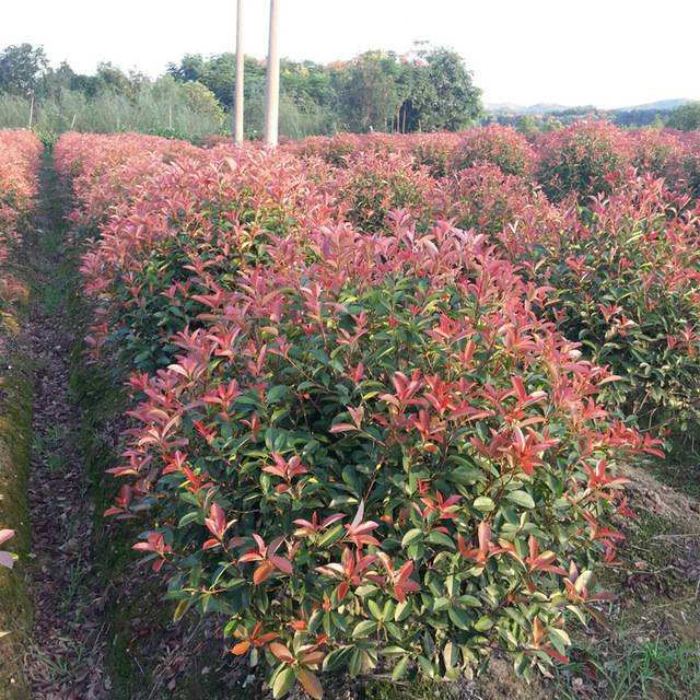 【红叶石楠球种植管理】红叶石楠苗期在苗高40厘米左右时,即进行打顶,促进分生多个侧枝(至少3-4个),...次打顶后仍达不到3-4个侧枝的,酌情进行第二次打顶。今后,因树冠上部枝条发展兴旺,故要重剪,旁边面枝要轻剪,实时疏除徒长枝,使整个树冠向中心挨近,逐渐“抱成一团”,再经轻剪整形后,即成球型。