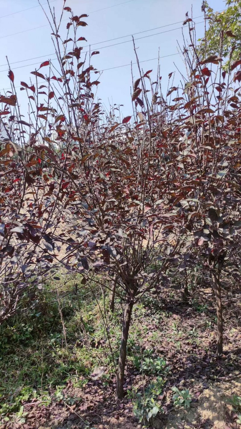 叶长卵形或卵状长椭圆形,长4-8厘米,先端渐尖,叶基部广楔形,叶缘有不整齐的细钝齿,叶面红色或紫色,背面色彩更红,新叶顶端鲜紫红色,当年生枝条木质部红色。花单生,中等偏小,淡粉红色,花瓣5片,微香,雄蕊多数,单雌蕊,花期4-5月。